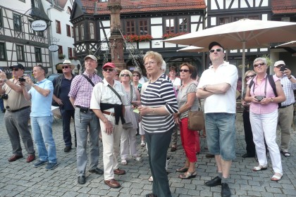In der Stille des Odenwaldes konnte sich Kultur, Geschichte und Gesundheit mit Geselligkeit - bei ausgezeichneter Küche - verknüpfen lassen. Michelstadt wurde mit einer Stadtführerin erkundet. Geschichtsträchtig waren u.a. das alte Rathaus (1484 erbaut), die Erbacher Rose aus Elfenbein und die Stadtmauer, welche von der - den Burggraben überquerenden - Brücke aus sehr schön zu sehen war. Am Begrüßungsabend überraschte und unterhielt uns in zeitgemäßer Tracht die sagenumwobene ,,Brunhild" mit stimmgewaltig in Szene gesetzten Erzählungen aus dem Leben Siegfrieds.