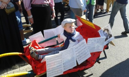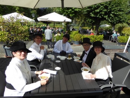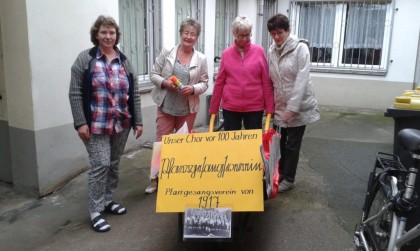 In diesem Jahr blickte man 100 Jahre zurück, als der Rhein noch viele gesunde Fische hatte und der ,,Pfarrgesangsverein" 1917 sich großer Beliebtheit erfreute. Auffallend die fantasievollen Kostüme der Chorgemeinschaft und der Erntedankwagen der Groov-Paten. Viele Zuschauer am Straßenrand feuerten die Teilnehmer an den ,,Tankstellen" an, denn es gab dort nicht nur alkoholhaltige flüssige Nahrung, sondern es mussten Hindernisse überwunden und andere Aufgaben erfüllt werden.